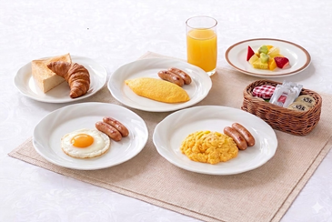 桃ジュース 【卵料理】 ~一品お選びください~ プレーンオムレツ フライドエッグ スクランブルエッグ ソーセージ パン フルーツ盛り合わせ |
