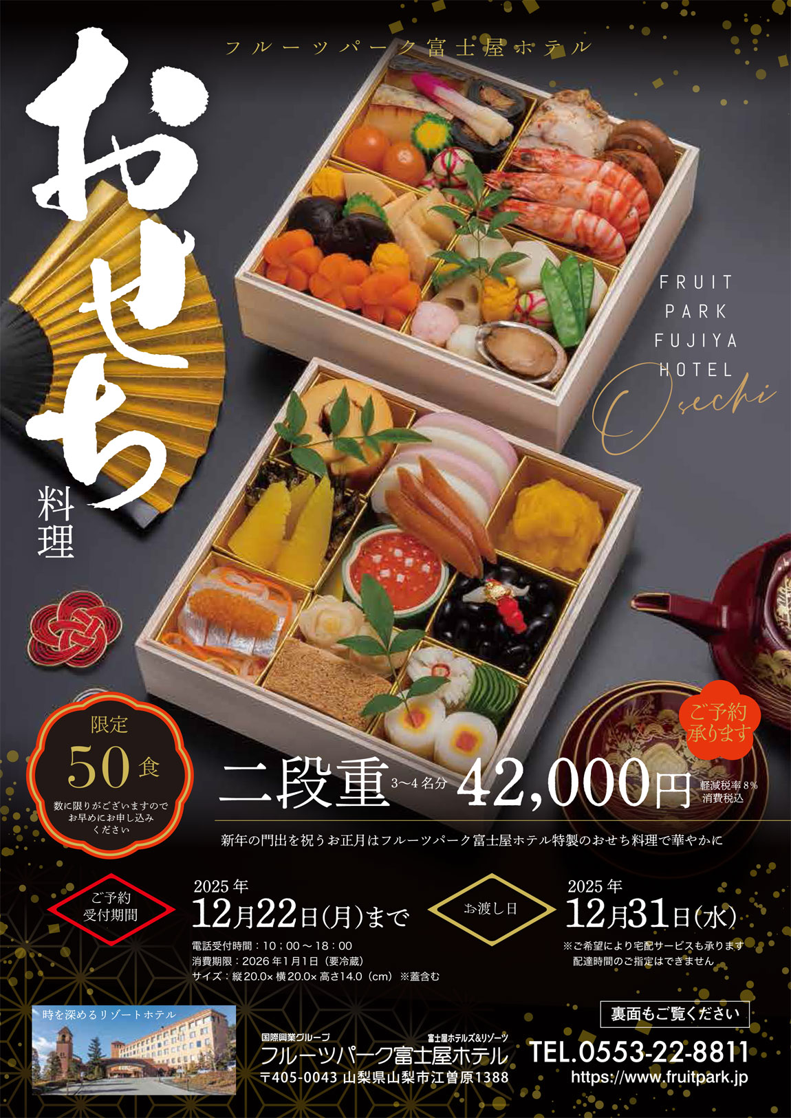 お電話またはFAXにてお申し込みください。 フルーツパーク富士屋ホテル TEL.0553-22-8811 FAX.0553-22-3988 |